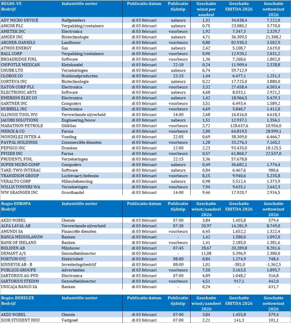 Bedrijfsresultaten zijn er vandaag in grote getale, met onder meer Amgen, Amundi, Archer Daniels, Atmos Energy, Bank of Ireland, Chipotle Mexican Grill, Chubb, DNB Bank, E.ON, Electronic Arts, Emerson Electric, Gilead Sciences, Gartner, Kinnevik, L’Oréal, Merck, Mondelez, Nokia, Novo Nordisk, Ørsted, PepsiCo, Prudential, , Sanofi, Schneider Electric, Super Micro Computer, Take‑Two Interactive, Western Union en dichter bij huis Xior Student Housing en Akzo Nobel.