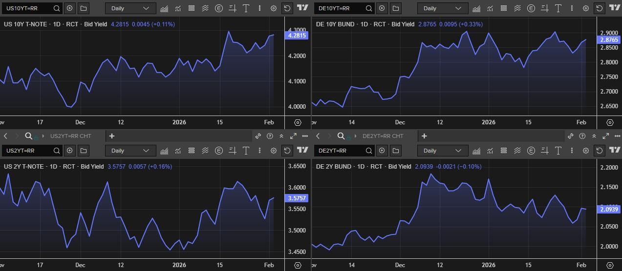 Ook de dollarindex herstelde opnieuw, net zoals de euro weer opveerde tegenover de Zwitserse frank na een en laagterecord op 0,915. Op de Europese obligatiemarkten stijgt de rente zo’n 2 basispunten over de hele curve, zowel in Duitsland als in de VS. De 10-jaarsrente noteert daarom op 2,88% en 4,27%, tegenover 2,09% en 3,57% op 2 jaar.