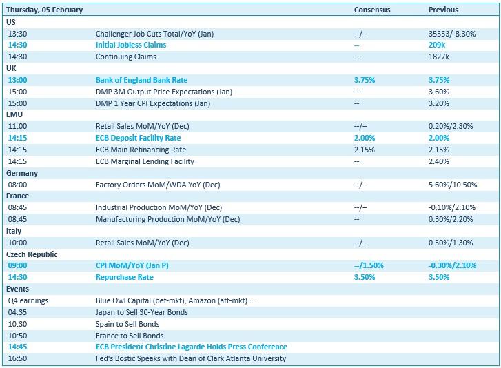 Op de economische kalender nemen enkele centrale banken een prominente plaats in. Zo komt de ECB met haar rentebesluit, waarna voorzitster Lagarde op een persconferentie komt uitleggen waarom de rente niet daalt. Ook in het VK en Tsjechië mogen de centrale bank aan de bak, waarbij vooral BoE-topman Andrew Bailey de schijnwerpers op zich gericht zal krijgen.