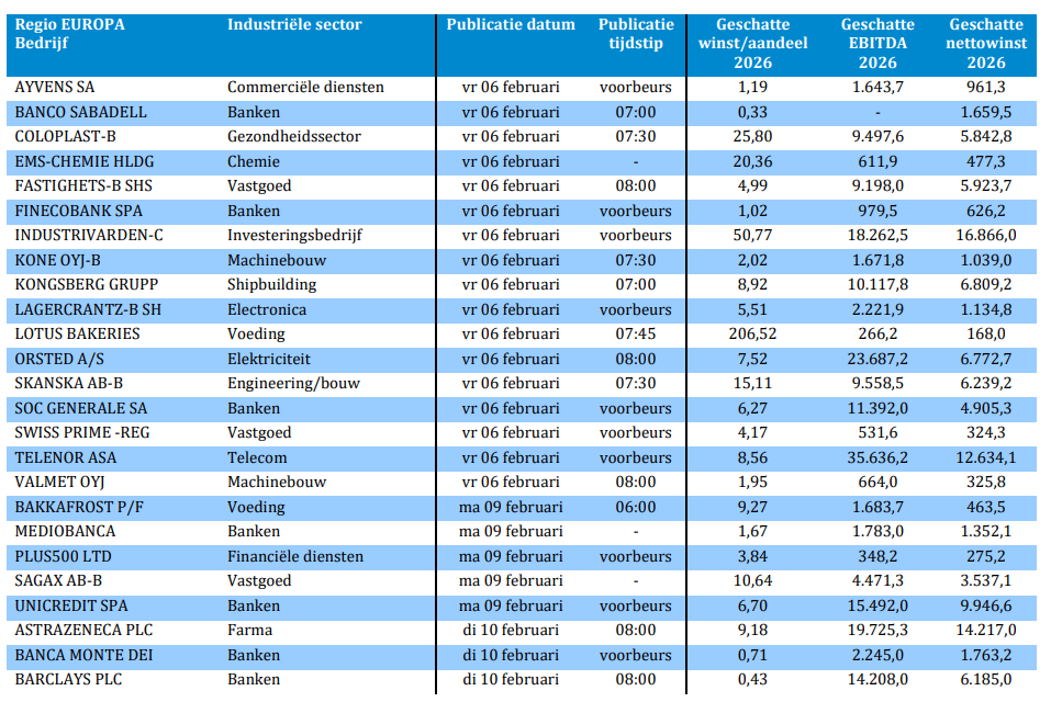 Bedrijfsresultaten komen er vandaag van Aperam, Ayvens, Banco Sabadell, Biogen, Carlyle Group, Cboe Global Markets, Centene, Coloplast, Ems-Chemie, Fastighets, Finecobank, Industrivarden, Kenvue, Kone, Kongsberg Gruppen, Lagercrantz, Lotus Bakeries, Orange Belgium, Orsted, Philip Morris, Skanska, Societe Generale, Tele2, Telenor, Valmet en Viomi Technology.
