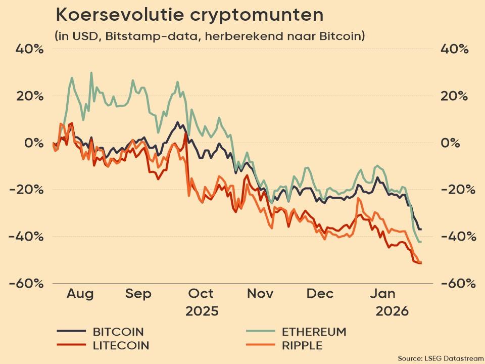 Voor de gekke capriolen moet u bij de edemetalen zijn, die diep in de Europese nacht eerst fors door de knieën gingen, om nadien weer te herstellen. De goudprijs veerde op van 4,650 tot 4,951 dollar (+2,1%), en zilver verloor eerst 13% om uiteindelijk op 74,4 dollar per ounce af te klokken (+5,07%). De Bitcoin verloor gisteren de strijd met de belangrijke technische grens van $70,000 om na een pandoering tot 60,000 dollar te herstellen tot 66.478,80 dollar. Ether kelderde tot 1,750 dollar, om daarna weer naar 1.958,40 dollar te stijgen. Eén van de verhalen in die winkel is dat Jeffrey Epstein onder zijn schuilnaam Satoshi Nakamoto de uitvinder van Bitcoin zou zijn. Het is maar wat u wil geloven.Maar goud hield zich relatief sterk (‑1,1% tot 4.911 dollar) om als één van de weinige ‘sterkhouders’ te fungeren, naar de Amerikaanse dollar. De euro verzwakte immers tegenover de dollar (‑0,14%), net zoals het Britse pond (‑0,27%). Maar los daarvan is duidelijk dat we gisteren opnieuw een duidelijk (macro-)verhaal ontbeerden. Ook daarom bewoog de rente nergens echt veel, en blijft de focus op de onderliggende marktonzekerheid liggen, met name in de softwaresector en via grondstoffen en edelmetalen.