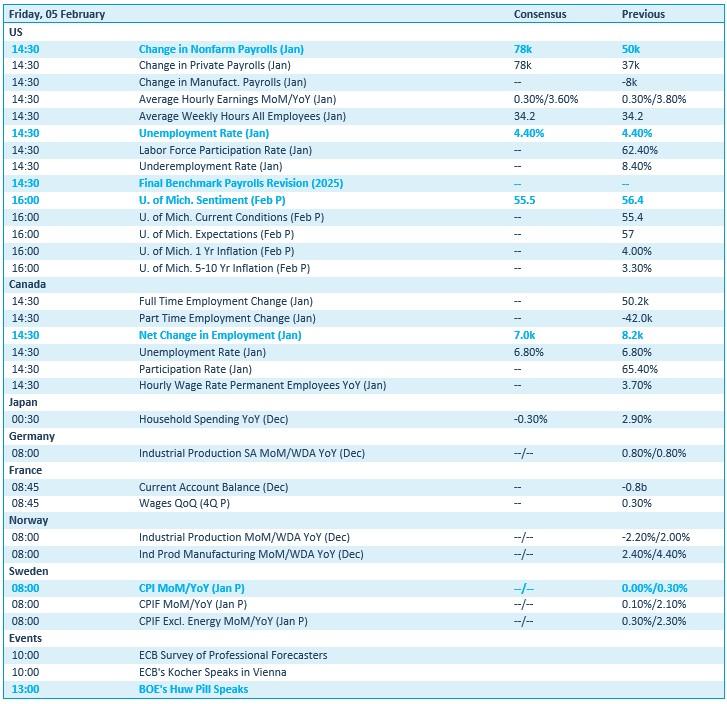 De Verenigde Staten komen vandaag met het belangrijke arbeidsmarktrapport op de proppen, inclusief de banengroei in januari tot nieuwe cijfers over loonontwikkeling en de inflatieverwachtingen van de Universiteit van Michigan. Uit Japan onthouden we de huishoudelijke bestedingen, terwijl Duitsland en Noorwegen nieuwe ramingen publiceren over de industriële productie. De Franse loonontwikkeling over het vierde kwartaal en de Zweedse inflatie zijn leuk om op te volgen, maar niet richtinggevend, terwijl er van de speeches van ECB‑bestuurder Kocher en BoE‑econoom Huw Pill ook niet veel vuurwerk verwacht wordt.