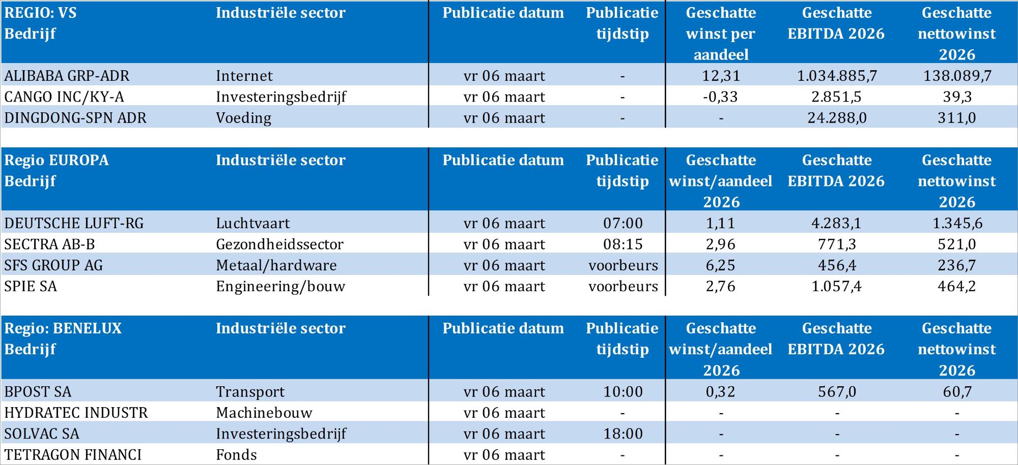Bedrijfsresultaten komen er vandaag van Alibaba Group, Bpost, Cango, Deutsche Luft, Dingdong, Hydratec, Sectra, SFS Group, Solvac, Spie en Tetragon.