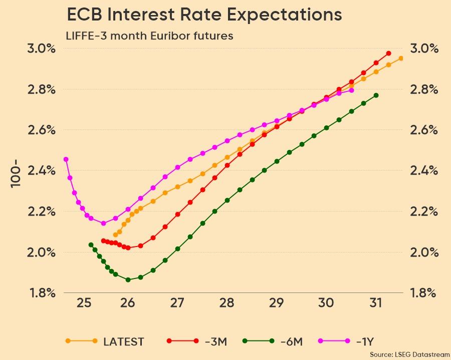 Vanaf 2027 is er consensus voor een geleidelijke verhoging tot en met 2030, maar zover zijn we vandaag nog niet. Ondertussen blijven beleggers de kans op een renteverlaging in de VS en in Europa verder uitprijzen, zodat vooral Europa de 2- en 10-jaarsrentes blijven stijgen, respectievelijk met 12 en 11 basispunten tot 2,23% en 2,84%. In de VS veerden beide rentes op met 6 en 5 basispunten tot 3,58% en 4,14%.