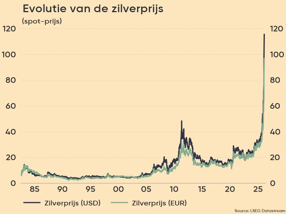 Goud en zilver profiteerden van veilige haven stromen te midden van geopolitieke spanningen, een verzwakkende Amerikaanse dollar en verwachtingen van een meer accommoderende Federal Reserve onder mogelijk nieuw leiderschap. De explosie van koper werd aangedreven door de exploderende vraag van AI-infrastructuur, uitbreiding van het elektriciteitsnet en elektrische voertuigen, nog verergerd door instortende voorraden. En speculatiedrift, vooral van Chinese investeerders, stuwde zilver voor het eerst tot boven 120 dollar, goed voor een stijging van 250% in het afgelopen jaar.