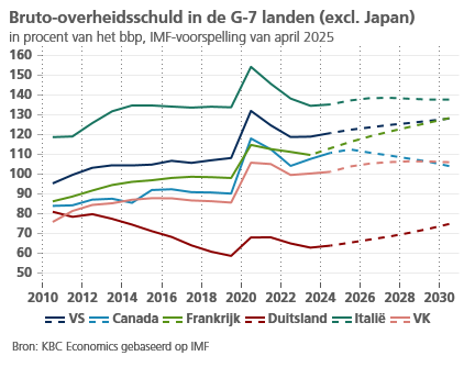 Ten slotte zal volgens de IMF-prognose ook de Duitse overheidsschuldratio op een opwaarts pad belanden. Al blijft Duitsland ook in de nabije toekomst met grote voorsprong het G7-land met de geringste overheidsschuld.