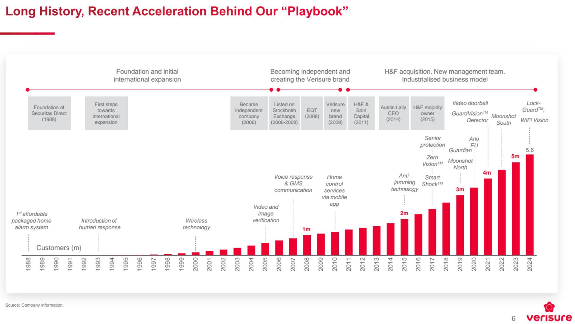 Opgericht in 1988 in Zweden als Securitas Direct, een divisie van Securitas AB (opgericht in 1934), die zich richt op bewaakte alarmen voor woningen en bedrijven. Het werd in 2006 afgesplitst als een onafhankelijke entiteit en in 2009 omgedoopt tot Verisure voor wereldwijde expansie. Verworven door private equity-firma Hellman & Friedman in 2015, die na de beursgang de meerderheidsaandeelhouder blijft.