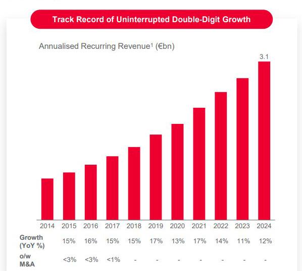 De omzet klom doorheen die periode jaren tot 3,4 miljard euro in 2024, met een aangepaste bedrijfswinst (EBIT) van 819 miljoen euro. Dat is goed voor een marge van 24%. Niet slecht, vooral niet omdat dat cijfer redelijk structureel is. Ongeveer 85-90% van de inkomsten is terugkerend, gekoppeld aan langetermijncontracten met klanten.