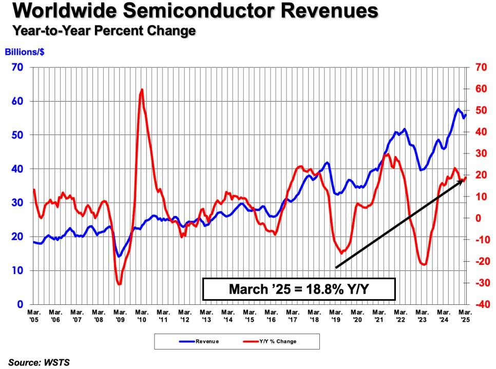 Op basis van de maandelijkse update van Semiconductor Industry Association steeg de wereldwijde verkoop van halfgeleiders in het eerste kwartaal van 2025 tot 167,7 miljard dollar, nadat de omzet in maart afklokte op 55,9 miljard dollar, een stijging van 1,8% op maandbasis. Daarmee krijgt maart het record voor hoogste omzet ooit op maandbasis; maar even zo goed daalde de wereldwijde verkoop vorig kwartaal met 2,1% op kwartaalbasis. De groei bot dus wel degelijk verder af, waarmee de trend van de voorbije maanden bevestigd wordt.