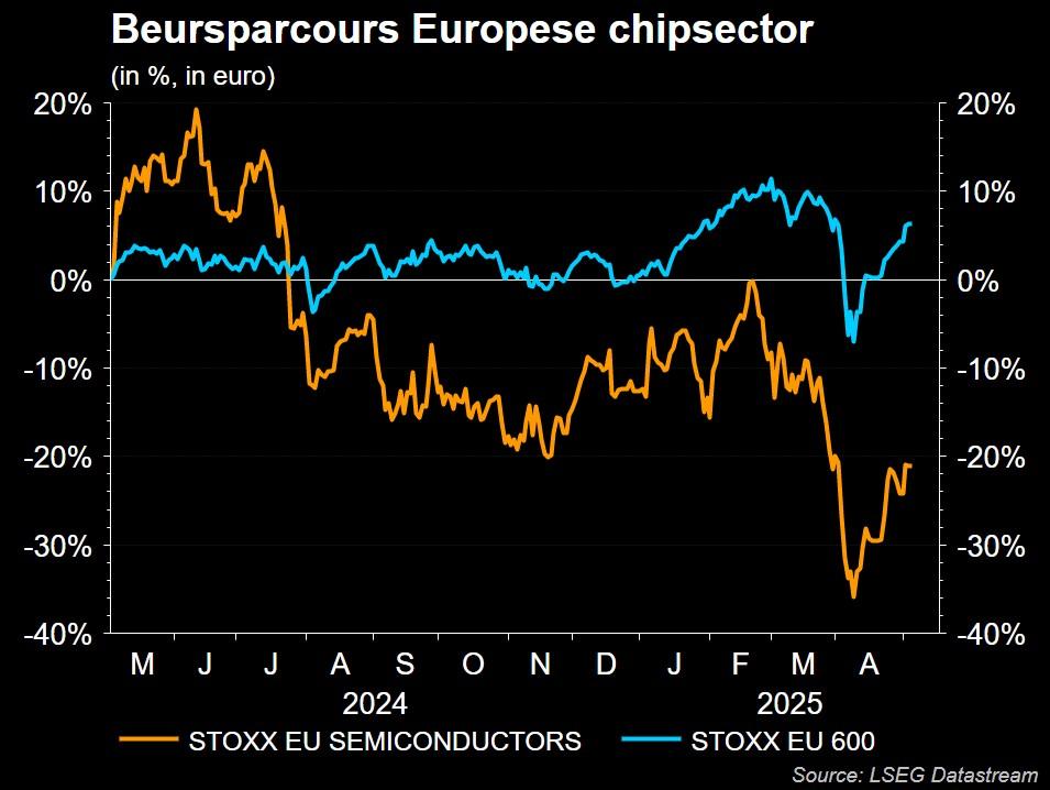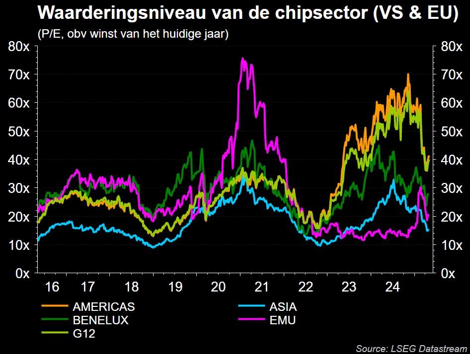 De Europese halfgeleiders kenden het voorbije jaar een eerder brakke prestatie, zoals duidelijk te zien is op bovenstaande grafiek. Die daling was groter dan de terugval van de winstverwachtingen, zodat de waarderingsniveaus de facto goedkoper werden. Die trend is overal ter wereld zichtbaar, maar omdat Azië en Europa vanop een lagere waarderingsbasis startten, bengelen beide regio’s nu onderaan de ladder. De respectievelijke koerswinstverhouding voor 2025 bedraagt nu 20x en 16x, tegenover niveaus van om en bij 40x voor de Amerikaanse chipbedrijven.