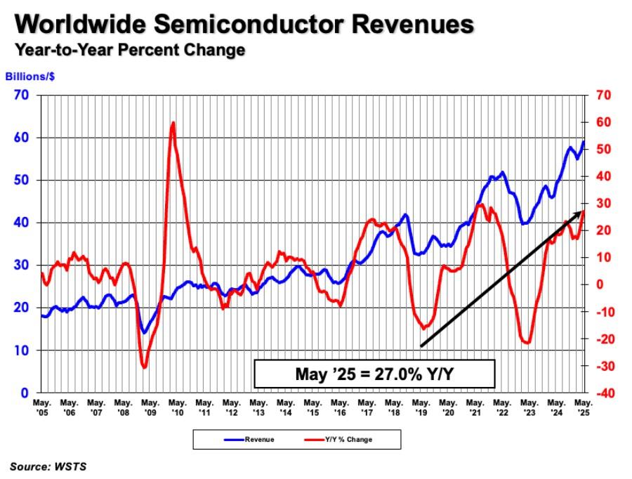 Op basis van de maandelijkse update van Semiconductor Industry Association steeg de wereldwijde verkoop van halfgeleiders in mei 2025 tot 58,98 miljard dollar, nadat de omzet in april afklokte op 56,96 miljard dollar, een stijging van 3,5% op maandbasis en 27% op jaarbasis. Daarmee neemt mei 2025 het record over voor hoogste omzet ooit op maandbasis. We noteren ook een groei met 7,4% op kwartaalbasis, wat zoveel wil zeggen dat de groei bot tot nader order niet verder af bot.