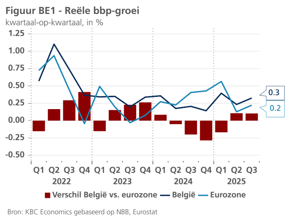 Het Belgische groeicijfer voor Q3 2025 (0,3%) kwam hoger uit dan dat van de eurozone (0,2%) (zie figuur BE1). In vergelijking met de buurlanden lag de Belgische groei boven die van Duitsland (0,0%) maar onder die van Frankrijk (0,5%) en Nederland (0,4%).
