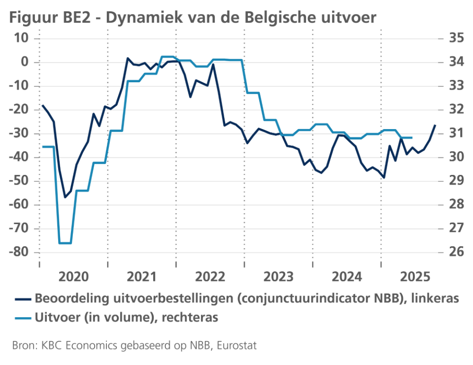 Volgens de eerste raming voor het derde kwartaal steeg de toegevoegde waarde in de drie grote sectoren. De groei van de toegevoegde waarde versnelde in zowel de diensten als de bouw, respectievelijk van 0,2% tot 0,4% en van 0,7% tot 1,3%. Na de kleine krimp in het tweede kwartaal (-0,1%) steeg de toegevoegde waarde in de industrie in het derde kwartaal met 0,2%. Gegevens over de bbp-component voor de groei in het derde kwartaal zijn nog niet beschikbaar. Waarschijnlijk was de gezinsconsumptie opnieuw veerkrachtig. Gegeven de duidelijke opleving van de uitvoerbestellingen gaan we er ook van uit dat de gevolgen van de Amerikaanse invoertarieven op de uitvoer beperkt zijn gebleven (zie figuur BE2).