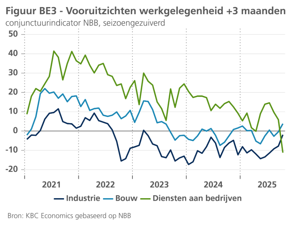 De sentimentsindicatoren lieten in oktober een gemengd beeld zien. Het consumentenvertrouwen bleef verbeteren. Een verdere scherpe daling van de bezorgdheid over de werkloosheid (opnieuw vooral in Wallonië) compenseerde de minder gunstige perceptie van consumenten over de algemene economische situatie. Aan de negatieve kant was de opvallendste indicator de daling van het sentiment in de dienstverlening aan bedrijven. Met name de verwachtingen voor de werkgelegenheid in de sector waren aanzienlijk minder optimistisch (zie figuur BE3). We blijven aan de voorzichtige kant en zien de groei in het vierde kwartaal iets vertragen tot 0,2%. Voor het volledige jaar 2025 blijven we uitgaan van een reële bbp-groei van 1,0%. De kwartaalgroei in Q3 was weliswaar sterker dan verwacht, maar in de jongste herzieningen van het INR werd het overloopeffect van 2024 naar de jaargroei in 2025 neerwaarts bijgesteld van 0,32% naar 0,25%. We hielden de dynamiek van de kwartaalgroei doorheen 2026 ongewijzigd, maar door het grotere overloopeffect van 2025 naar 2026 (nu 0,38% in plaats van 0,24% eerder) werd de groei voor heel 2026 naar boven bijgesteld van 0,9% naar 1,1%.