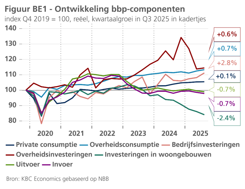 Het Instituut voor de Nationale Rekeningen (INR) bevestigde de eerdere flashraming voor de Belgische bbp-groei in het derde kwartaal van 2025 op 0,3% (kwartaal-op-kwartaal). In de industrie bedroeg de groei van de toegevoegde waarde iets meer dan eerder geraamd (0,3% in plaats van 0,2%), terwijl dat in de diensten en vooral in de bouw lager was (0,3% in plaats van 0,4% respectievelijk 0,9% in plaats van 1,3%). Inzake bbp-componenten waren er een aantal opvallende ontwikkelingen (zie figuur BE1). De groei van de private consumptie vertraagde behoorlijk tot nog slechts 0,1%. De investeringen in woongebouwen bleven stevig krimpen, ditmaal met 2,4%. De bedrijfsinvesteringen stegen daarentegen met een sterke 2,8%. De overheidsconsumptie en -investeringen namen met respectievelijk 0,7% en 0,6% toe. De uitvoer en invoer daalden beide met 0,7%, wat resulteerde in een licht positieve groeibijdrage van de netto-uitvoer (+0,1 procentpunt). Tot slot werd de Q3-groei afgeremd door een grote negatieve bijdrage van de voorraadwijziging (-0,4 procentpunt).