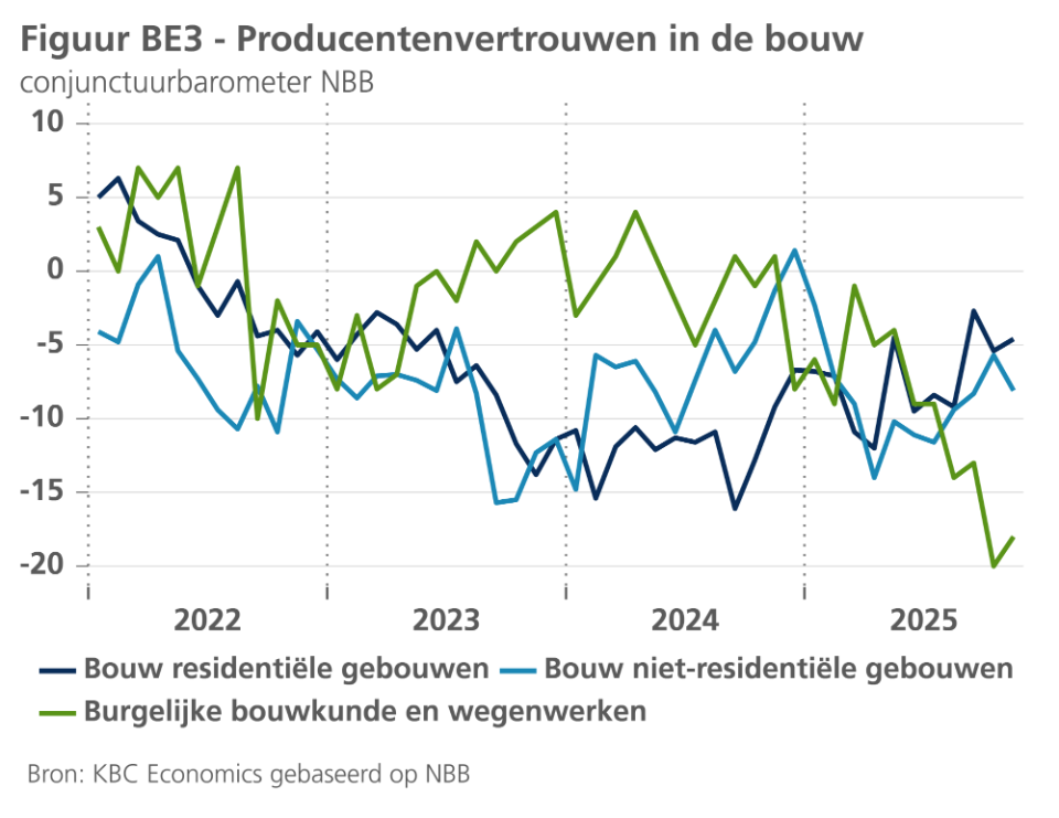 Meer in het algemeen veerde het vertrouwen van de Belgische ondernemers in november op, na een bescheiden daling in de voorgaande maand. De onderliggende trend van het vertrouwen bleef dus stijgen, ondanks de aanhoudende onzekerheid rond het internationale economische en geopolitieke klimaat. Een positief element is dat, althans tot nu toe, de gevolgen van de Amerikaanse invoertarieven op de Belgische uitvoer beperkt lijken te zijn gebleven. Hoewel enige impact nog altijd mogelijk blijft, geeft de verdere opleving van de beoordeling van de uitvoerbestellingen hoop dat het uiteindelijke effect van de Amerikaanse tarieven op de Belgische economie niet zo sterk zal zijn als eerder werd gevreesd.