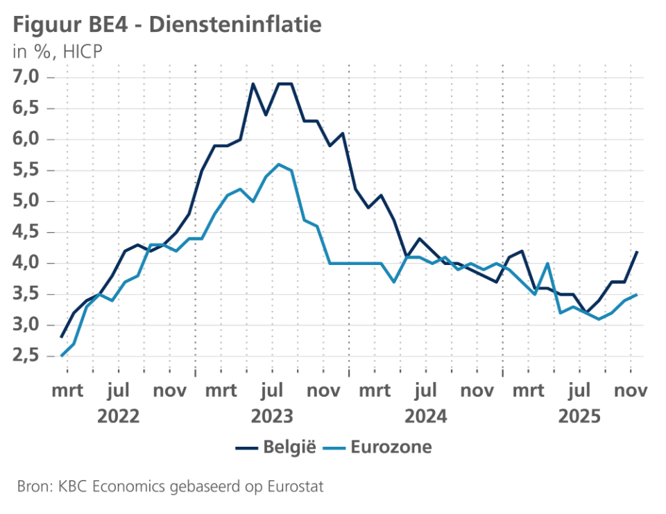 We hebben onze raming voor de bbp-groei in het laatste kwartaal van 2025 licht opwaarts bijgesteld naar 0,3%, toe te schrijven aan de aanhoudende positieve trend in het industrieel vertrouwen. De groeiraming voor heel 2025 blijft op 1,0%. Het pad van de kwartaalgroei in 2026 werd ongewijzigd gelaten, wat resulteert in een jaargroei van 1,1% in 2026. De Belgische HICP-inflatie kwam in november uit op 2,6%, iets hoger dan de 2,5% in oktober. De kerninflatie (exclusief energie en voeding) steeg sterker, van 2,5% naar 2,8%, en ligt nu 0,7 procentpunt boven het dieptepunt van 2,1% dat in augustus werd bereikt. De stijging werd vooral veroorzaakt door de hogere diensteninflatie (zie figuur BE4). Het risico van een aanhoudend hogere diensteninflatie in de komende maanden wordt gecompenseerd door een lagere verwachte energie-inflatie, doordat termijncontracten momenteel wijzen op een lager pad voor de olie- en gasprijzen dan een maand geleden. Daarom handhaven we onze prognose voor de gemiddelde Belgische HICP-inflatie in 2026 op 1,6%, komende van 3,0% in 2025.