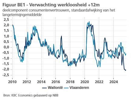 Het vertrouwen van zowel consumenten als ondernemingen trok in september verder aan. Het consumentenvertrouwen ligt nu ruim boven zijn langetermijngemiddelde. Als we kijken naar de ontwikkeling van de indicator sinds het jaarbegin, dan is de opmerkelijke verbetering in sterke mate het gevolg van de optimistischere werkloosheidsverwachtingen van consumenten. Waarschijnlijk zijn veel antwoorden in de consumentenenquête beïnvloed door de beleidsbeslissing om de duur van de werkloosheidsuitkering in te perken. De respondenten geloven duidelijk (vooral in Wallonië) dat de werkloosheid zal dalen als gevolg van de hervormingsmaatregel (zie figuur BE1).