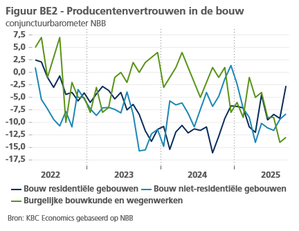 Het producentenvertrouwen, dat nog altijd onder zijn langetermijngemiddelde noteert, steeg in september in alle grote sectoren en het sterkst in de bouw. Vooral het vertrouwen in de woningbouw vertoonde die maand een opmerkelijke verbetering (zie figuur BE2). Verschillende andere toekomstgerichte indicatoren wijzen de laatste tijd eveneens op een langzame opleving van de woninginvesteringen. Zo lijkt het aantal toegekende bouwvergunningen (een belangrijke indicator voor op til staande woningbouwprojecten) uit te bodemen.