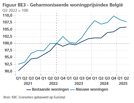 Begin oktober publiceerde Eurostat geharmoniseerde woningprijscijfers voor het tweede kwartaal van 2025. In de EU als geheel stegen de prijzen met 1,6% tegenover het vorige kwartaal. De kwartaalprijsstijging was het sterkst (meer dan 4%) in Portugal, Luxemburg, Kroatië en Spanje. In twee landen daalden de prijzen, zij het erg beperkt. België is een van deze twee landen (het andere is Frankrijk), met een minuscule prijsdaling van 0,1% (zie ook Economisch Bericht van 15 oktober 2025 “Europese woningmarkt stoomt verder door in tweede kwartaal 2025”). De prijscorrectie betrof alleen nieuwbouw (-0,7%). De prijzen van bestaande woningen bleven stijgen, dit keer met slechts 0,2%. De kleine prijsdaling in België voor woningen als geheel volgde op drie eerdere kwartalen van behoorlijke prijsstijgingen. Doorgaans zijn de kwartaalveranderingen in de woningprijzen vrij volatiel. Het tweedekwartaalcijfer zorgde voor enige afzwakking van het robuuste tempo van de prijsstijgingen in de nieuwbouw sinds het voorjaar van 2023 (zie figuur BE3). De tweedekwartaalcijfers veranderen onze visie op het Belgische vastgoed niet wezenlijk. Voor het geheel van woningen (bestaande en nieuwe samen) zien we nu een gemiddelde prijsstijging van 2,6% in 2025 en 3,1% in 2026, komende van 3,0% in zowel 2025 als 2026 in onze vorige prognose.